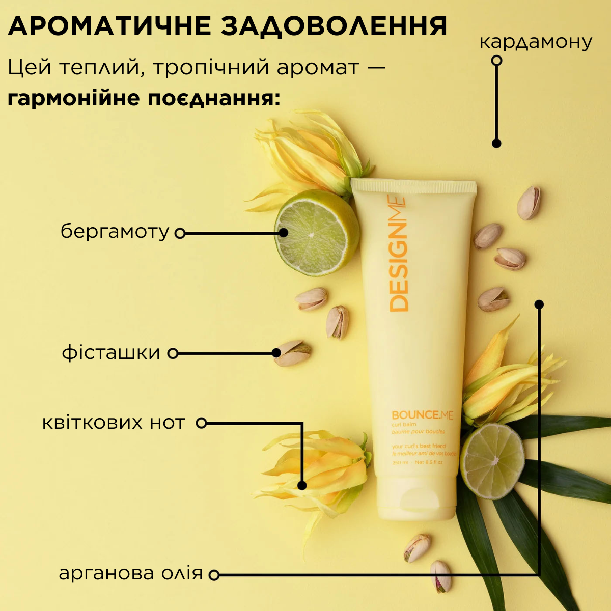 BOUNCE.ME Curl Balm — це легкий бальзам для укладки, створений спеціально для хвилястого та кучерявого волосся. Він підкреслює природну текстуру, усуває пухнастість і забезпечує еластичну фіксацію без склеювання чи жорсткості. Формула з аргановою олією, пантенолом і зволожувальними компонентами зберігає пружність завитків, надає блиск і захищає від термічного впливу.