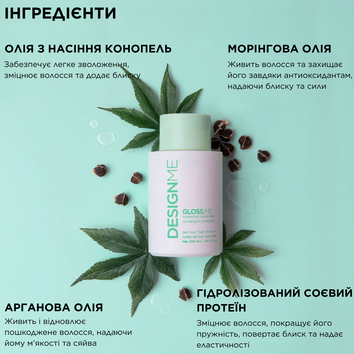 GLOSS.ME Hydrating Conditioner to nawilżająca odżywka, która intensywnie odżywia i zmiękcza włosy bez ich obciążania. Dzięki połączeniu olejków z konopi, arganowego i moringa pomaga odbudować zniszczoną strukturę, przywraca włosom blask, elastyczność i podatność na układanie. Odpowiedni do wszystkich rodzajów włosów, szczególnie suchych, farbowanych lub łamliwych.