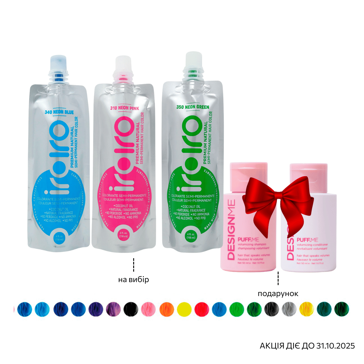 АКЦІЙНИЙ КОМПЛЕКТ: Барвники ІроІро 118 мл (3 будь-яких відтінків) + Подарунок PUFF.ME Shampoo & Conditioner 60 мл