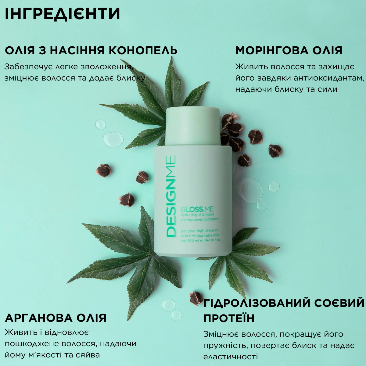 GLOSS.ME Hydrating Shampoo - это увлажняющий шампунь для всех типов волос, который бережно очищает, не нарушая естественного баланса. Благодаря комплексу из каннабисового, арганового, морингового масел и витамина Е, он глубоко питает, уменьшает сухость, придает блеск и эластичность. Подходит для ежедневного использования, включая окрашенные, поврежденные или пористые волосы.